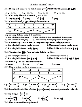 ĐỀ KIỂM TRA THỬ 18H30’ Câu 1: Phương trình tiếp tuyến với đồ thị hàm số tại điểm là: A. B. C. D. Câu 2: Các khoảng đồng biến của hàm số là: A. B. C. D. . Câu 3: Cho biết hàm số có bảng biến thiên như sau Trong các khẳng định sau, khẳng định nào đúng: A. Hàm số có hai điểm cực đại. B. Hàm số có hai điểm cực đại và một điểm cực tiểu. C. Hàm số có hai điểm cực trị. D. Hàm số có một điểm cực đại và hai điểm cực tiểu. Câu 4: Cho hàm số . Trong các khẳng định sau, khẳng định nào sai. A. Hàm số nghịch biến trên khoảng . B. Hàm số đồng biến trên khoảng . C. Hàm số nghịch biến trên khoảng . D. Hàm số đồng biến trên khoảng . Câu 5: Cho hàm số . Trong các khẳng định nào sau đúng. A. Hàm số nghịch biến trên R. B. Hàm số đồng biến trên R. C. Hàm số nghịch biến trên . D. Hàm số đồng biến trên và . Câu 6: Hàm số đạt cực đại tại. A. B. C. D. Câu 7: Bảng biến thiên sau đây là của hàm số nào. A. B. C. D. Câu 8: Điểm M có hoành độ âm trên đồ thị sao cho tiếp tuyến tại M vuông góc với đường thẳng là: A. B. C. D. Câu 9: Hàm số nào sau đây không có cực trị? A. B. C. D. Câu 10: Giá trị của m để hàm số nghịch biến trên mỗi khoảng xác định là: . B. C. D. Câu 11: Tìm tham số m để hàm số đồng biến trên TXĐ của nó A. B. C. D. Câu 12: Tìm tất cả các giá trị số m để hàm số đạt cực đại tại . A. B. C. D. Câu 13: Tìm các giá trị của m để hàm số: đạt cực trị tại A. B. C. D. Câu 14: Xác định m để hàm số có 1 cực trị. A. B. C. D. Câu 16: Tìm tất cả các giá trị số m để đồ thị hàm số nghịch biến trên khoảng . A. B. C. D. Câu 17: Hàm số có 2 điểm cực trị thỏa . A. B. C. và D. Câu 18: Cho hàm số . Chọn phương án đúng sau A. B. C. D. Câu 19: Cho hàm số , giá trị nhỏ nhất của hàm số trên bằng 2 khi A . B. C. D. Câu 20: Cho hàm số , giá trị nhỏ nhất của hàm số trên là A. B. C. D. Câu 21: Cho hàm số: Giá trị lớn nhất của hàm số trên khoảngbằng A. B. C. D. Câu 22: Giá trị lớn nhất của hàm số là A. B. C. D. Câu 23: Tìm m để đồ thị của hàm số có ba điểm cực trị tạo thành một tam giác vuông. A. B. C. D. Câu 24: Cho hàm số y = f(x) liên tục trên khoảng (-3 ;2) và có bảng biến thiên như hình vẽ dưới đây. Mệnh đề nào sau đây đúng ? A. B. C. D. Câu 25: Đồ thị hàm số có dạng: A B C D Câu 26: Đồ thị hàm số có dạng: A B C D Câu 27: Đồ thị hàm số có dạng: A B C D Câu 28: Tìm để hàm số chỉ có cực tiểu mà không có cực đại. A. B. C. D. Câu 29: Cho hàm số với m là tham số thực. Tìm m để đồ thị hàm số đã cho có 3 điểm cực trị lập thành một tam giác có trọng tâm là gốc tọa độ. A. B. C. D. HD: +) Hàm số có 3 cực trị có 3 nghiệm phân biệt có 3 nghiệm phân biệt (1) +) Khi đó 3 điểm cực trị: +) Ta có tam giác ABC cân tại A thuộc trục , B và C đối xứng nhau qua và trung tuyến kẻ từ A thuộc trục . +) Do đó O là trọng tâm của tam giác ABC +) Kết hợp với (1) suy ra giá trị cần tìm của m là . Câu 30: Tìm m để đồ thị hàm số có 3 điểm cực trị tạo thành một tam giác đều. A. B. C. D.