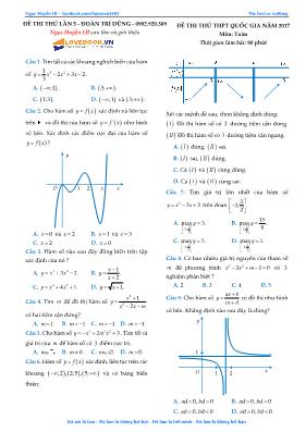 Ngọc Huyền LB – facebook.com/huyenvu2405 The best or nothing Đã nói là làm - Đã làm là không hời hợt - Đã làm là hết mình - Đã làm là không hối hận ĐỀ THI THỬ LẦN 5 - ĐOÀN TRÍ DŨNG - 0902.920.389 Ngọc Huyền LB sưu tầm và giới thiệu ĐỀ THI THỬ THPT QUỐC GIA NĂM 2017 Môn: Toán Thời gian làm bài: 90 phút Câu 1. Tìm tất cả các khoảng nghịch biến của hàm số 3 2 1 2 3 2 3 y x x x . A. ;1 . B. 3; . C. 1;3 . D. ;1 và 3; . Câu 2. Cho hàm số y f x xác định và liên tục trên và đồ thị của hàm số 'y f x như hình vẽ bên. Xác định các điểm cực đại của hàm số y f x ? A. 0x và 2x B. 1x và 3x C. 2x D. 0x Câu 3. Hàm số nào sau đây đồng biến trên tập xác định của nó ? A. 3 23 2.y x x B. 1 . 2 x y x C. 4 24 1.y x x D. 1.y x Câu 4. Tìm m để đồ thị hàm số 2 2 1 2 x y x x m có hai tiệm cận đứng? A. 1m B. 1m C. 1m D. 1m Câu 5. Cho hàm số 4 2 22 3y x m x . Tìm tất cả giá trị của m để hàm số có 3 điểm cực trị . A. .m B. 0.m C. .m D. 0.m Câu 6. Hàm số y f x xác định, liên tục trên các khoảng ;2 , 2;5 , 5; và có bảng biến thiên: Xét các mệnh đề sau, chọn khẳng định đúng: I Đồ thị hàm số có 2 đường tiệm cận đứng. II Đồ thị hàm số có 1 đường tiệm cận ngang. A. I đúng, II sai. B. I sai, II đúng. C. Cả I và II cùng đúng. D. Cả I và II cùng sai. Câu 7. Tìm giá trị lớn nhất của hàm số 3 3 3y x x trên đoạn 3 3; . 2 A. 3 3; 2 max 3.y B. 3 3; 2 15 max . 8 y C. 3 3; 2 max 5.y D. 3 3; 2 max 1.y Câu 8. Có bao nhiêu giá trị nguyên của tham số m để phương trình 3 23 1 0x x m có 3 nghiệm phân biệt ? A. 2 B. 3 C. 4 D. 5 Câu 9. Cho hàm số x ax b y c d có đồ thị như hình vẽ bên. Khẳng định nào sau đây là đúng? A. d 0, d 0a b B. d 0, d 0a b C. d 0, d 0a b D. d 0, d 0a b y O x 1 2 3 y O x 1 2 1 Ngọc Huyền LB – facebook.com/huyenvu2405 The best or nothing Đã nói là làm - Đã làm là không hời hợt - Đã làm là hết mình - Đã làm là không hối hận Câu 10. Cho hàm số 3 3y x ax b có đồ thị C . Gọi ,A B là hai điểm trên đồ thị C tại đó có tiếp tuyến với C song song nhau và có hệ số góc bằng 3. Biết rằng khoảng cách từ gốc tọa độ tới đường thẳng AB bằng 1? Tìm giá trị nhỏ nhất của 2 2P a b ? A. 6 5 B. 3 2 C. 4 3 D. 7 6 Câu 11. Ông Hùng có 50m lưới hàng rào. Ông muốn rào miếng đất thành hai chuồng kín hình chữ nhật để một chuồng nuôi gà, một chuồng nuôi vịt. Biết hai chuồng có chung một vách ngăn cũng bằng lưới trên. Hỏi ông Hùng có thể rào hai chuồng với tổng diện tích lớn nhất bằng bao nhiêu ? A. 2 625 . 8 m B. 2 625 . 6 m C. 2 5000 . 49 m D. 2 625 . 4 m Câu 12. Tính đạo hàm của hàm số 3log 2y x . A. 2 ln3.y x B. 1 . 2 ln3 y x C. 1 . ln3 y x D. 4 ln3.y x Câu 13. Cho hàm số 5 x y m . Tìm tất cả giá trị của m để hàm số nghịch biến trên . A. 4 5.m B. 0 1.m C. 4 5.m D. 5.m Câu 14. Bất phương trình 2 2 10 3 4 12 2 x x x có bao nhiêu nghiệm nguyên dương ? A. 2 B. 3 C. 4 D. 6 Câu 15. Cho các số thực dương , ,x y z khác 1 và thỏa mãn 1xyz . Tìm giá trị nhỏ nhất của biểu thức: log log log 2 log log log z x y x y z y xz yx z A z x y y z x A. 4 2 B. 6 3 C. 6 2 D. 3 Câu 16. Đường cong C ở hình bên là đồ thị của 1 trong 4 hàm số được liệt kê sau đây. Hỏi hàm số đó là hàm số nào? A. .y x B. 3 2 .y x C. 3 1 .y x D. .y x Câu 17. Cho , ,a b x là các số thực dương. Biết 3 13 3 log 2log logx a b , tính x theo a và b . A. 4 . a x b B. . a x b C. 4x a b D. 4 .x a b Câu 18. Cho các số thực ,a b thỏa 2 3 3 5a a và 2 3 log log . 3 5b b Khẳng định nào sau đây là khẳng định đúng? A. 0 log 1. a b B. log 0. b a C. log 1. a b D. 0 log 1. b a Câu 19. Cho các số thực dương , ,a b c với 1, 1.ab c Khẳng định nào sau đây là khẳng định đúng ? A. log log .logab a bc c c B. log log log ab a b c c c C. log .log log . log log a b ab a b c c c c c D. log log log . log .log a b ab a b c c c c c Câu 20. Cho ,x y là các số thực dương thỏa 9 6 4 log log log . 6 x y x y Tính tỉ số x y . A. 3. x y B. 5. x y C. 2. x y D. 4. x y Câu 21. Xét số thực 2 2 log log .... 2m trong đó bên trong biểu thức có 2017 dấu căn thức. Phương trình m mx x m có bao nhiêu nghiệm thực phân biệt? A. 1 B. 2 C. 3 D. Vô nghiệm y O x 1 1 (C) Ngọc Huyền LB – facebook.com/huyenvu2405 The best or nothing Đã nói là làm - Đã làm là không hời hợt - Đã làm là hết mình - Đã làm là không hối hận Câu 22. Tìm nguyên hàm của hàm số 2 .xf x A. 1.2 .xf x dx x C B. 2 ln2 . xf x dx C C. 12 . 1 x f x dx C x D. 2 . ln2 x f x dx C Câu 23. Với mỗi số tự nhiên n , ta đặt: 1 0 n x n I x e dx . Mệnh đề nào sau đây đúng? A. 12 1n nI e n I B. 1n nI e nI C. 1n n I e nI D. 11n nI e n I Câu 24. Cho hàm số y f x liên tục trên và là hàm số chẵn. Biết rằng 3 0 0 4 3, 7.f x dx f y dy Tính giá trị của tích phân 4 3 I f t dt . A. 10.I B. 4.I C. 7 . 3 I D. 21.I Câu 25. Tính tích phân 1 2 0 4 3 dx I x x . A. 3 ln . 2 I B. 1 3 ln . 3 2 I C. 1 3 ln . 2 2 I D. 1 3 ln . 2 2 I Câu 26. Viết công thức tính diện tích S của hình phẳng D giới hạn bởi hai đồ thị hàm số y f x , y g x liên tục trên đoạn ;a b và các đường thẳng , .x a x b A. . b a S f x g x dx B. . b a S f x g x dx C. . b a S f x g x dx D. . b a S f x g x dx Câu 27. Tính diện tích hình phẳng giới hạn bởi các đường 1 x y x , 3x và các trục tọa độ? A. 8 